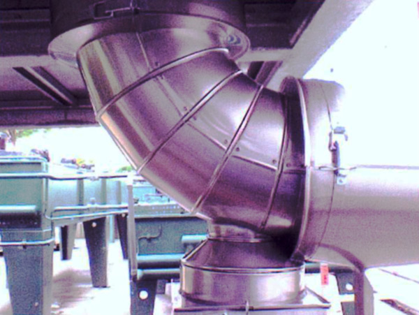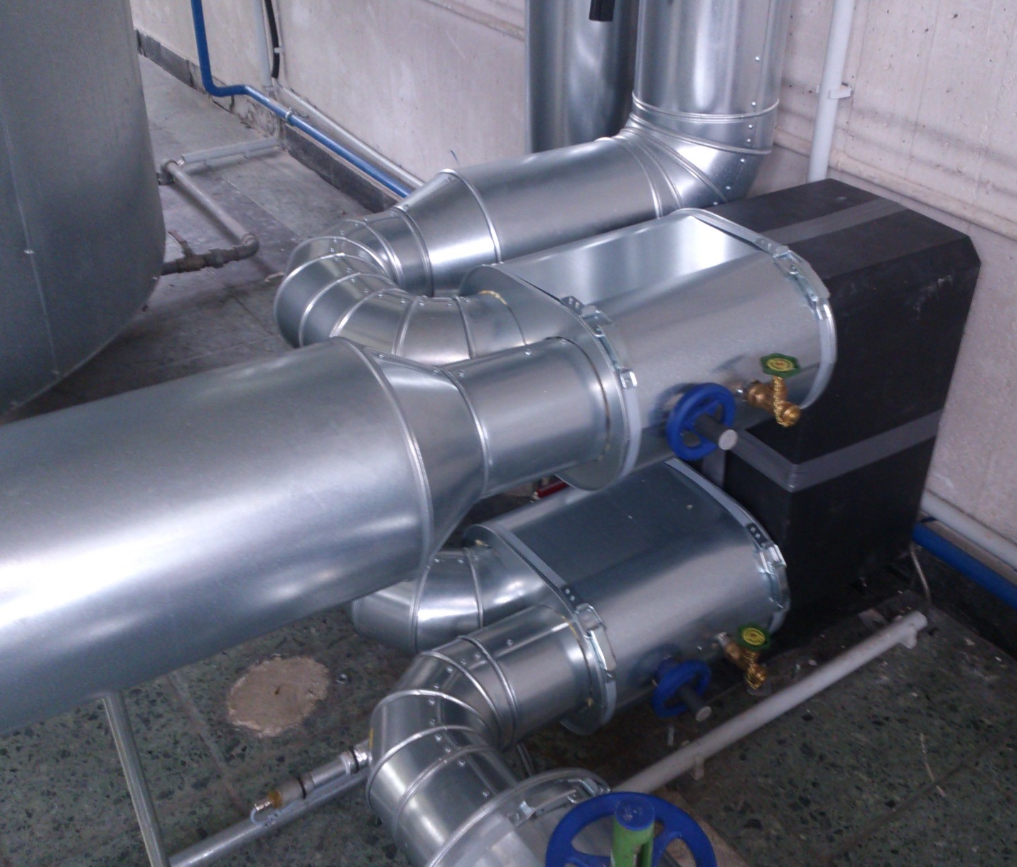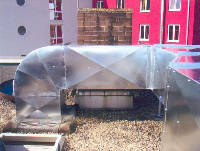 Isolierung gegen Tauwasserbildung eines Zuluftkanals, auf dem Dach einer Hotelanlage. Die Dämmung besteht aus einem wasserdampf-diffusionsdichtem Material (AF-Armaflex 19 mm Plattenmaterial). Zusätzlich wurde eine Ummantelung aus verzinktem Stahlblech als Verwitterungsschutz aufgebracht. |